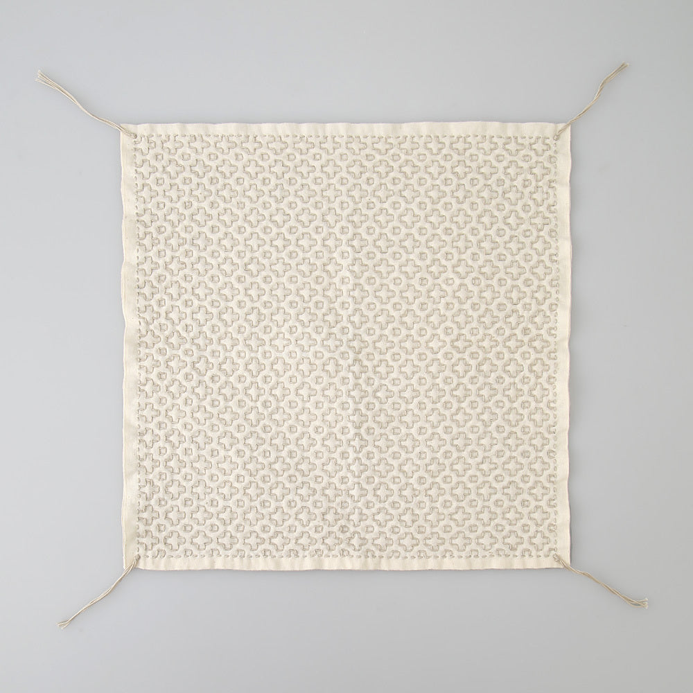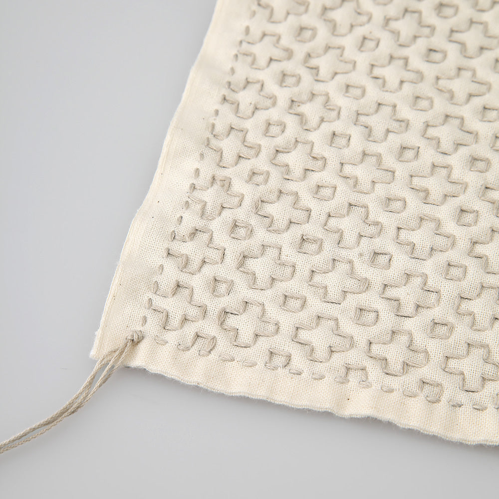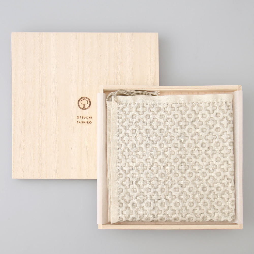 大槌のお母さんたちによる手仕事の温もりが伝わる「大槌刺し子」。生成りの生地に草木染めの柔らかな風合いの糸で「変わり花十字」という華やかな柄を刺しました。「心豊かな生活に寄り添えるように。」そんな想いを込めたふきんです。手作業で染められた草木染の糸と晒しを使用しています。大槌刺し子のロゴをあしらった桐箱に収めてお届けします。