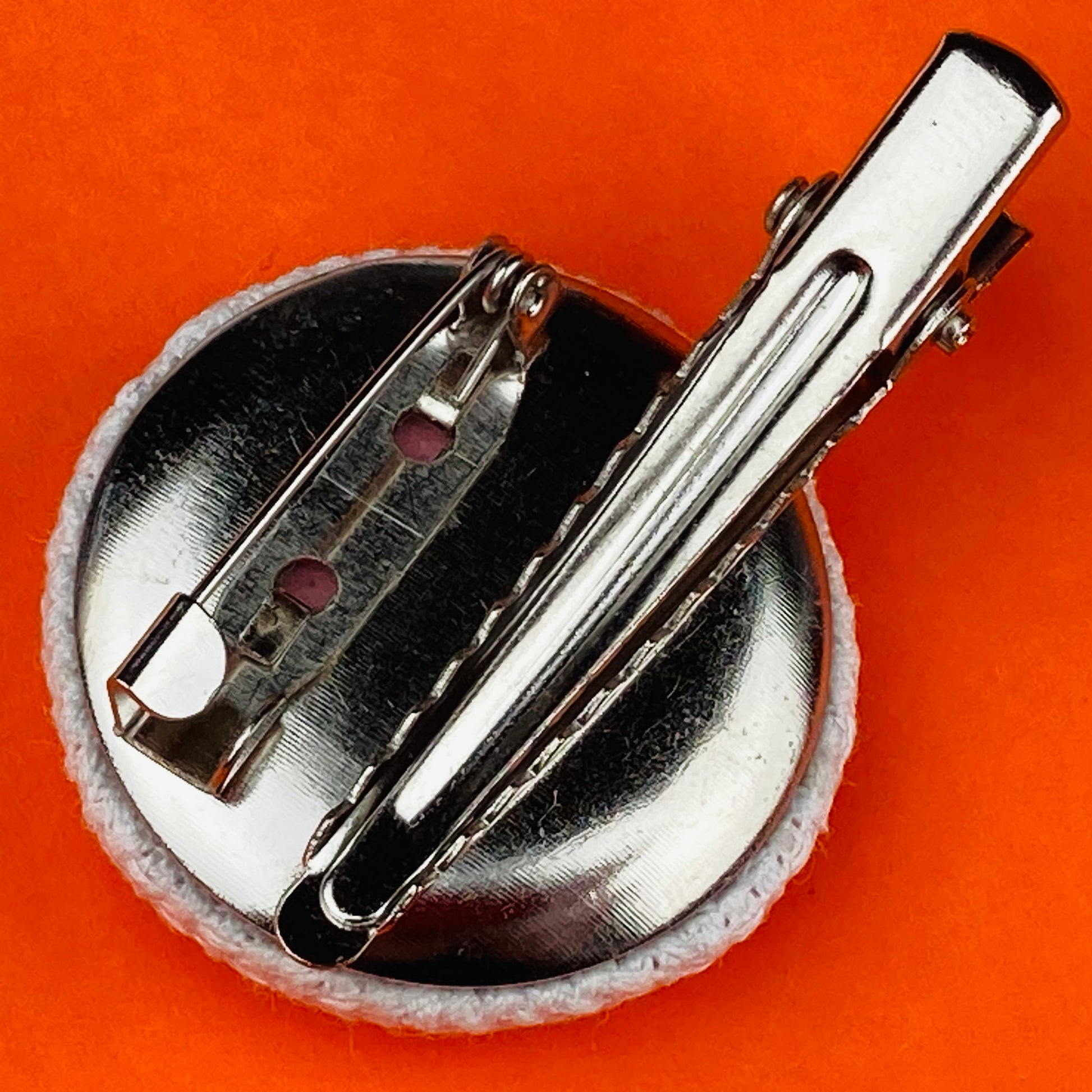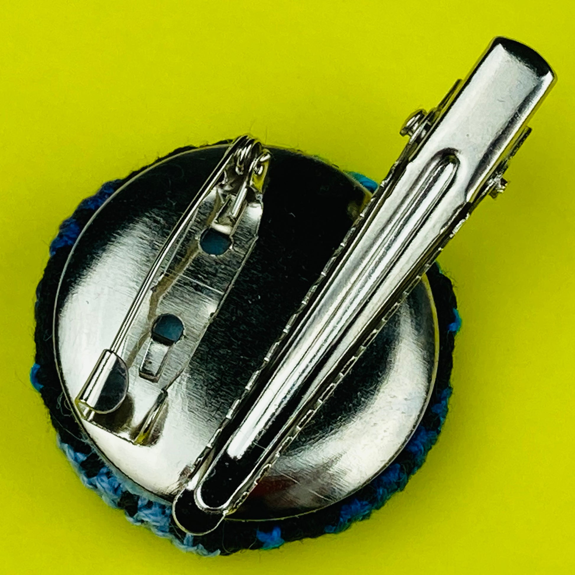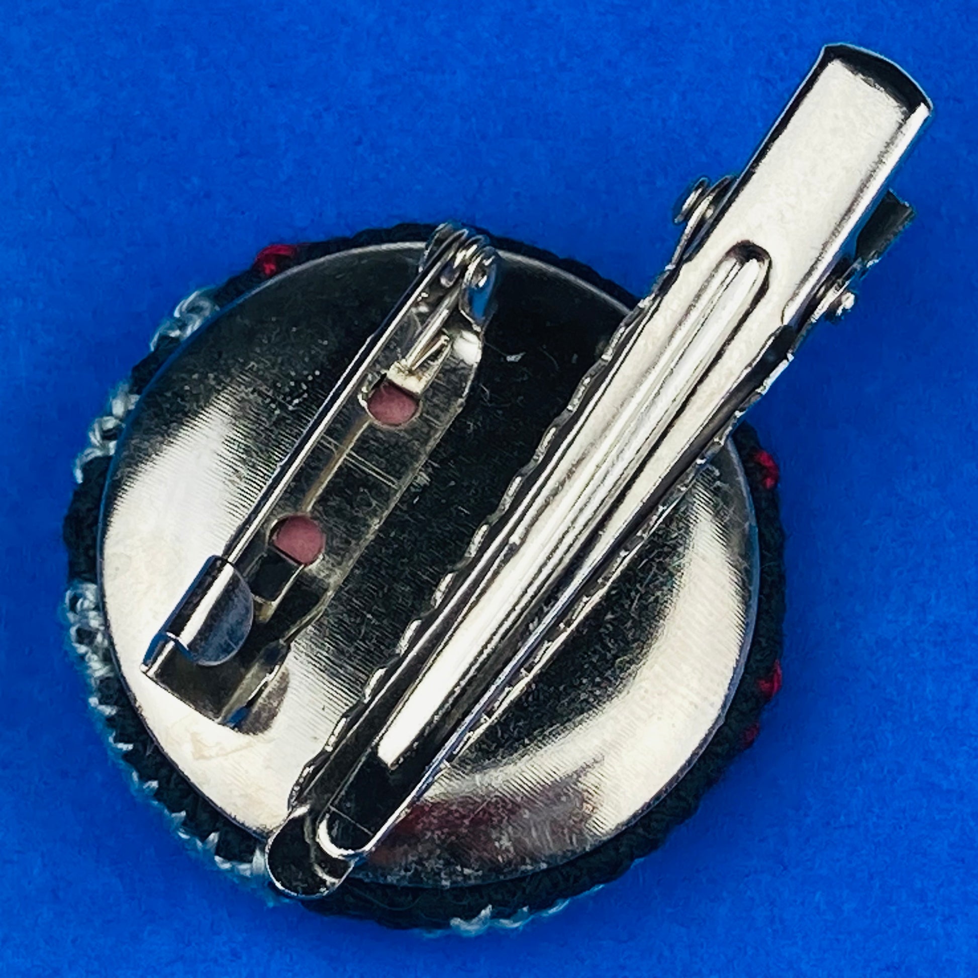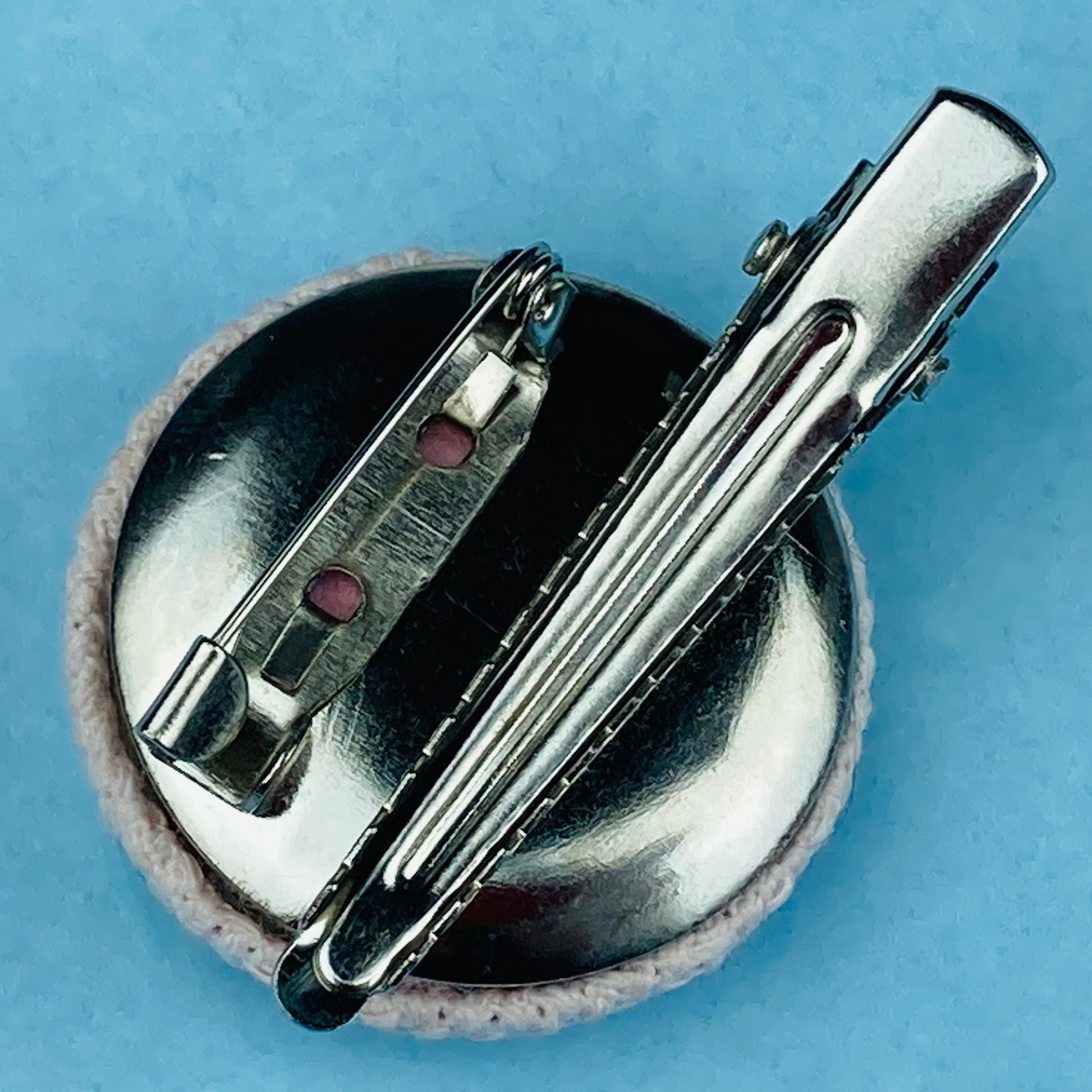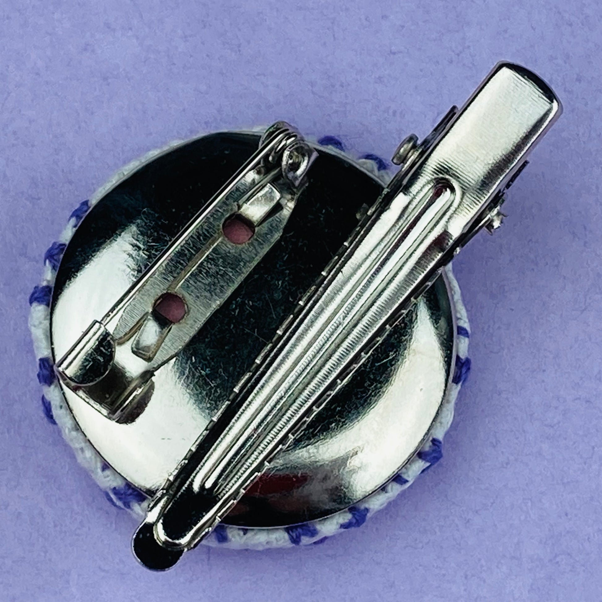 クロスステッチで仕上げたくるみボタンのブローチです。