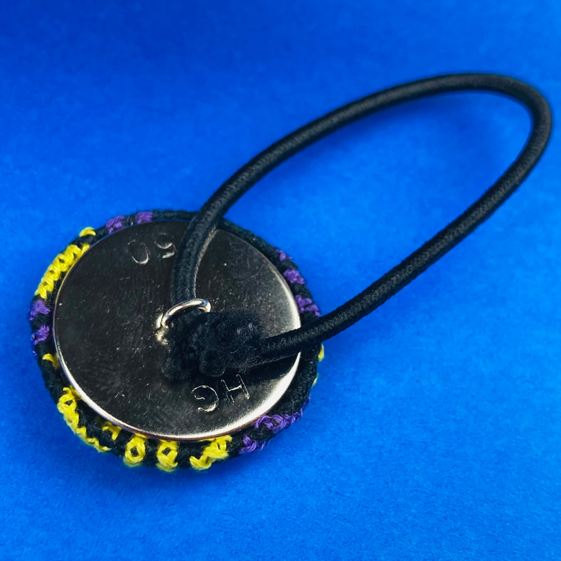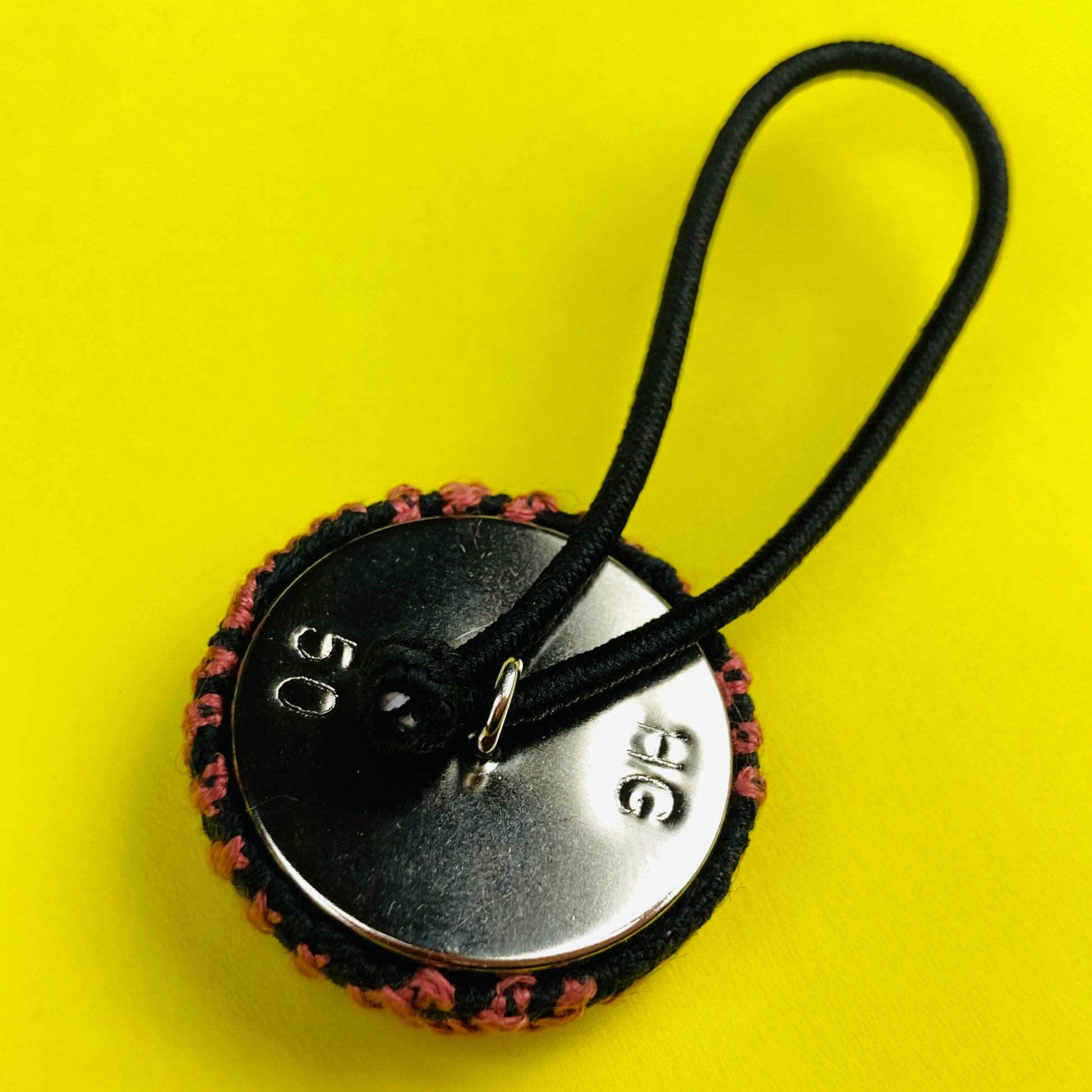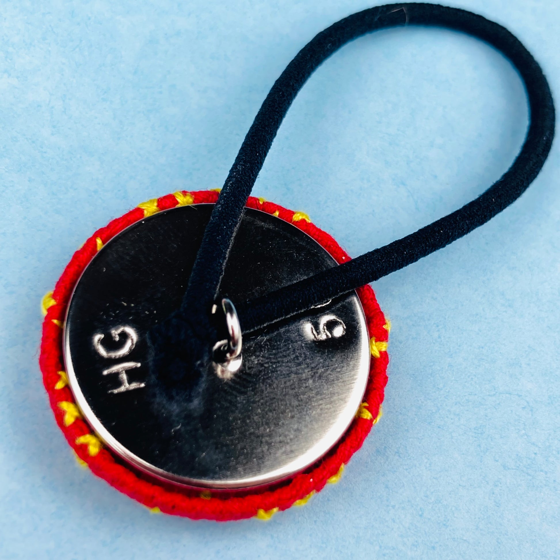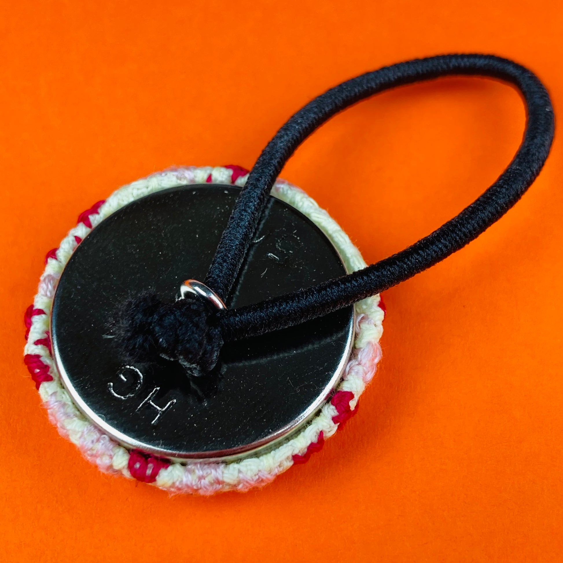 クロスステッチで仕上げたくるみボタンのヘアゴムです。